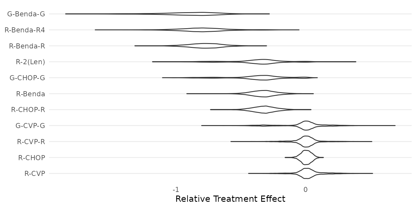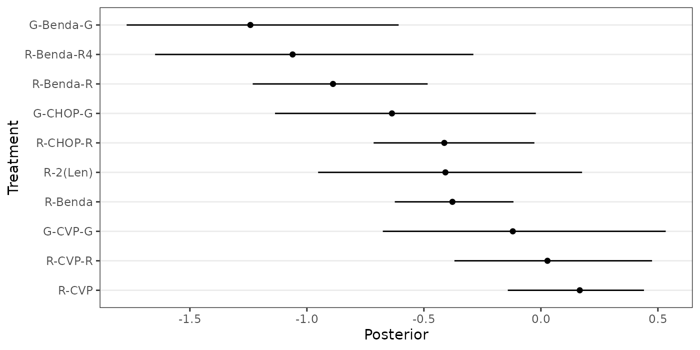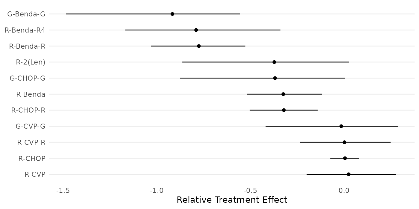 "R-CVP","R-CVP-R","R-2(Len)","G-CVP-G","G-CHOP-G","G-Benda-G")The following forest plot displays the relative treatment effects of the 11 treatments in the study, as estimated by Wang et. al (2022).