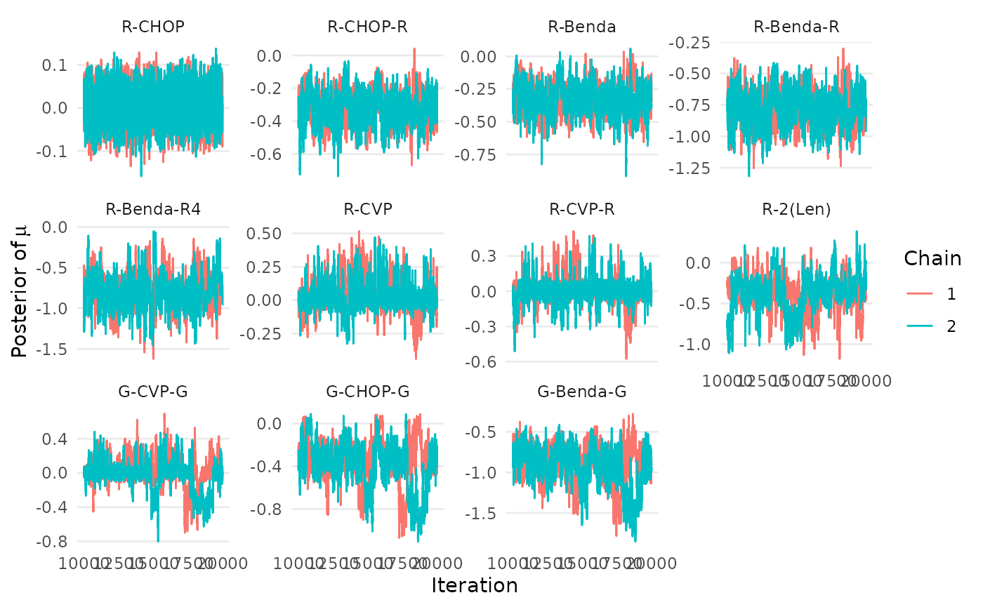 #> [1] "Estimating chain 2 of 2."The package contains three functions to assess if the MCMC chains